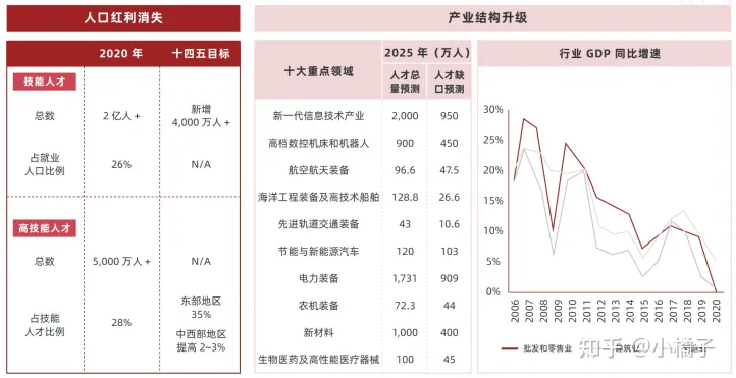 据人社部统计,2020 年底我国技能人才仅占就业人口总数的 26%,高技能人才占技能人才的 28%。人社部印发的《“技能中国行动”实施方案》明确要求十四五期间要实现技能人才数量的提升。伴随着产业结构的升级, 我国对新一代信息技术、 新材料等技术密集型领域的人才需求不断加大 ; 而如批发零售业、 制造业、建筑业等附加值低的劳动密集型行业增速放缓,劳动力供给过剩,行业从业者面临着失业的压力,急需提升职业技能。劳动力市场就业和招工的两难问题并存,职业教育面临着庞大的市场需求。