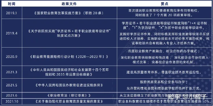 《职业教育法(修订草案)》中提出,“职业教育与普通教育是不同教育类型,具有同等重要地位”,同时提出,国家建立健全职业学校教育和职业培训并重的职业教育体系,支持产教深度融合,支持学校教育与职业培训学习成果转换、职业教育与普通教育的学习成果融通、互认。这意味着,从教育体系角度,普通教育、学历职业教育及职业培训均拥有重要地位,受政策支持鼓励,是提升国民素养、促进就业的重要环节。