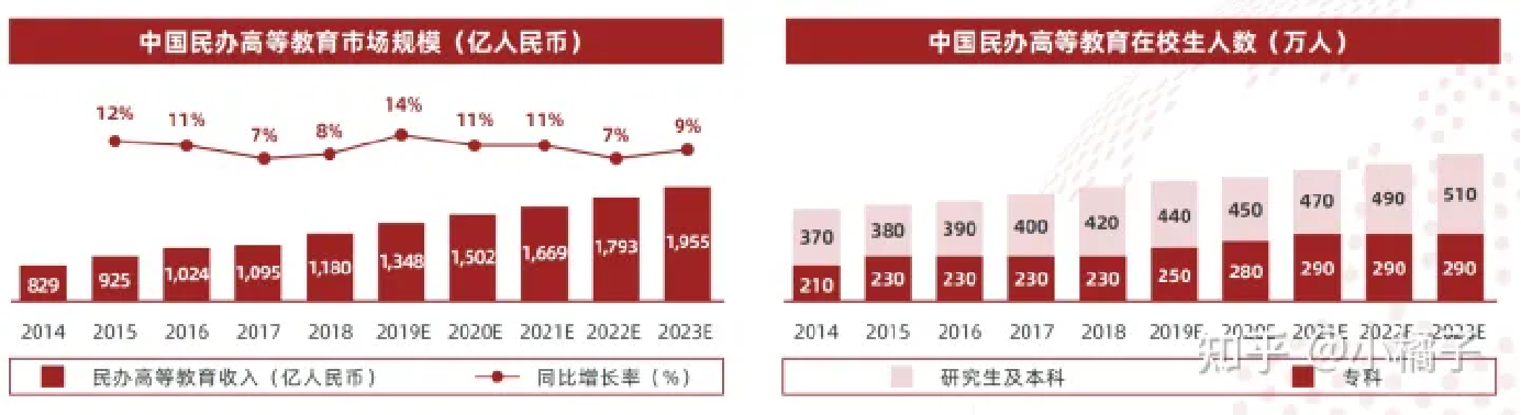 中国民办高等教育市场规模约为 1,700 亿人民币,为高等教育市场的十分之一左右(公办占比九成)。与公办高校不同,民办学校的资金来源主要为学生学费收入,其他则包括政府拨款(约占 12%)及投资者投入等。从在校生和招生人数来看,民办高校人数近年来持续增长,占高校人数比例维持在 23%-24%,其中研究生与本科占比 62%,专科占比 38%。