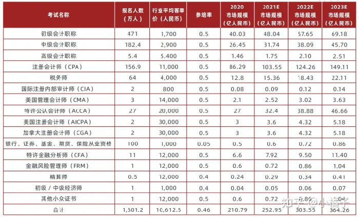 2023 年金融财会考证培训市场规模有望突破 360 亿人民币。国内外各金融财会证书考试报名人数如下表所示,其中,客单价的统计是根据行业内代表性公司的平均客单价计算的, 参培率是根据不同品类的实际情况估算的。估算出不同证书的未来三年不同的增长率,假设参培率与客单价不变,预计 2021 年、2022 年、2023 年金融财会考证的市场规模分别为 252.95亿人民币、303.55 亿人民币及 364.26 亿人民币。