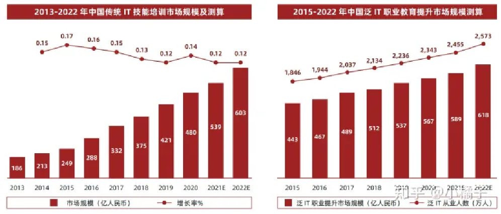 非学历 IT 培训市场规模随着传统 IT 技能培训与泛 IT 职业提升的快速发展而不断提升,在 2021 年突破千亿,行业未来发展空间与前景巨大。