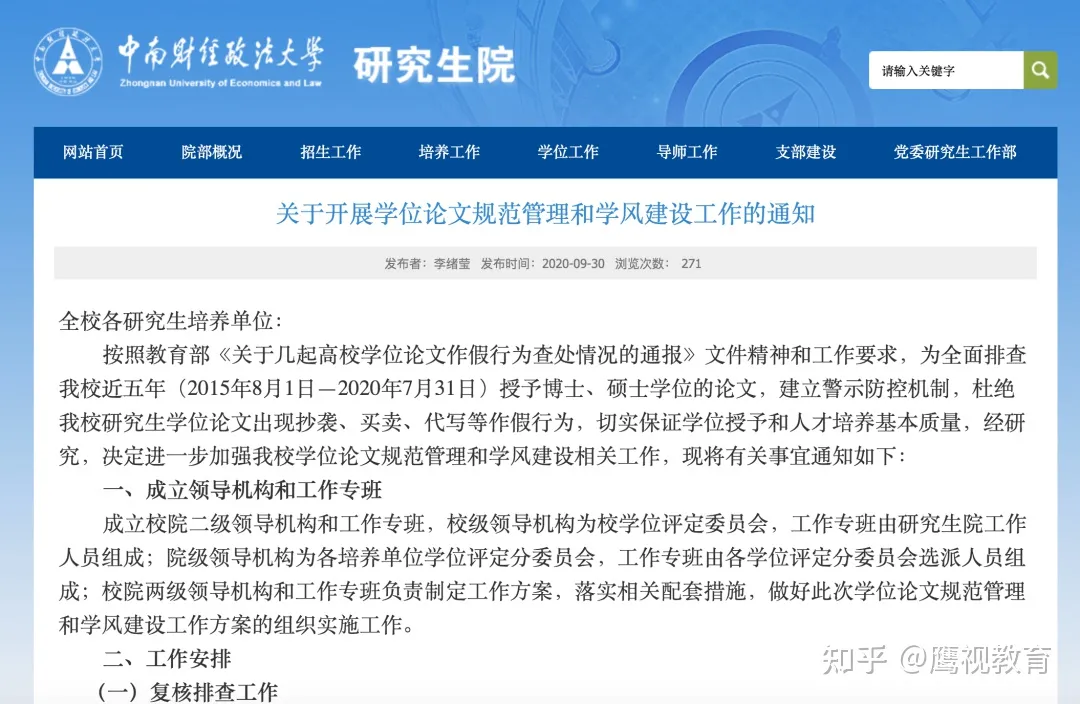 中南财经政法大学发布《关于开展学位论文规范管理和学风建设工作的通知》,对该校近五年硕博学位论文正式进行全面排查,并复核近五年授予博士、硕士学位的学位论文的过程管理。
