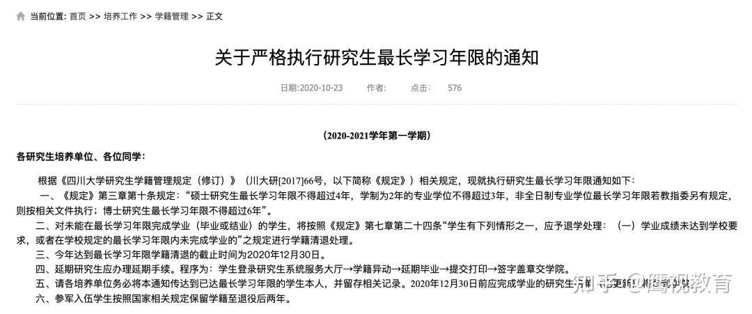 据悉,10月底,四川大学刚发布《关于严格执行研究生最长学习年限的通知》。通知称“硕士研究生最长学习年限不得超过4年;博士研究生最长学习年限不得超过6年”。