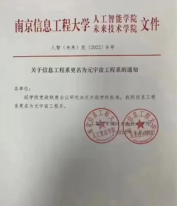 近日南京信息工程大学一则文件引发关注该校人工智能学院(未来技术学院)信息工程系更名为元宇宙工程系